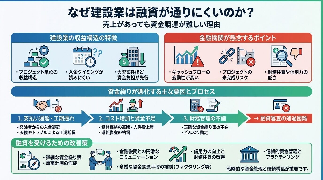 建設業はプロジェクト単位の収益構造のため、入金タイミングが読みにくい特徴があります。
