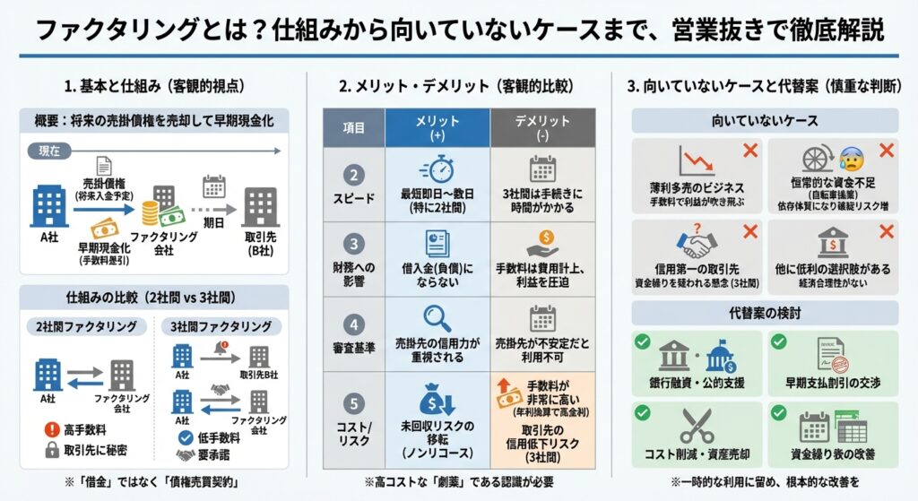 ファクタリングとは?仕組みと向いていないケースを整理する5つの判断ポイント【営業抜き】